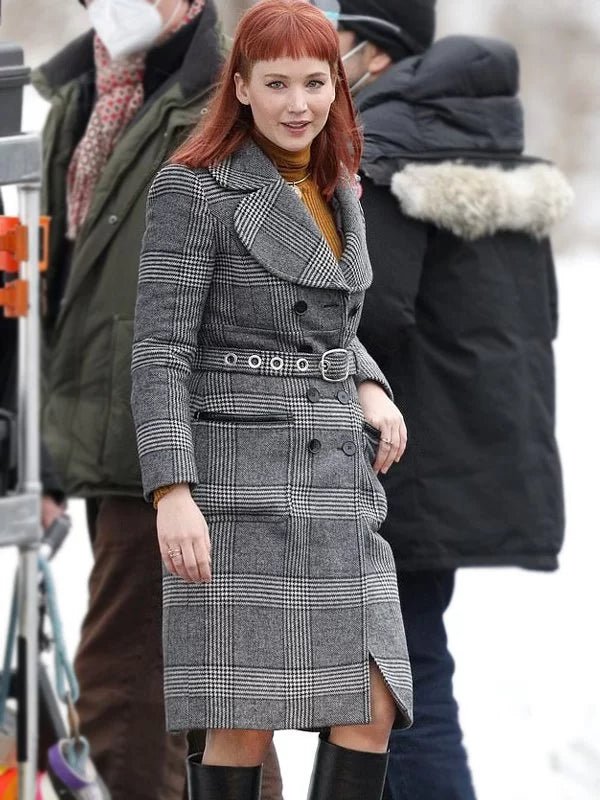 Jennifer Lawrence Don’t Look Up Kate Dibiasky Grey Checked Trench Coat