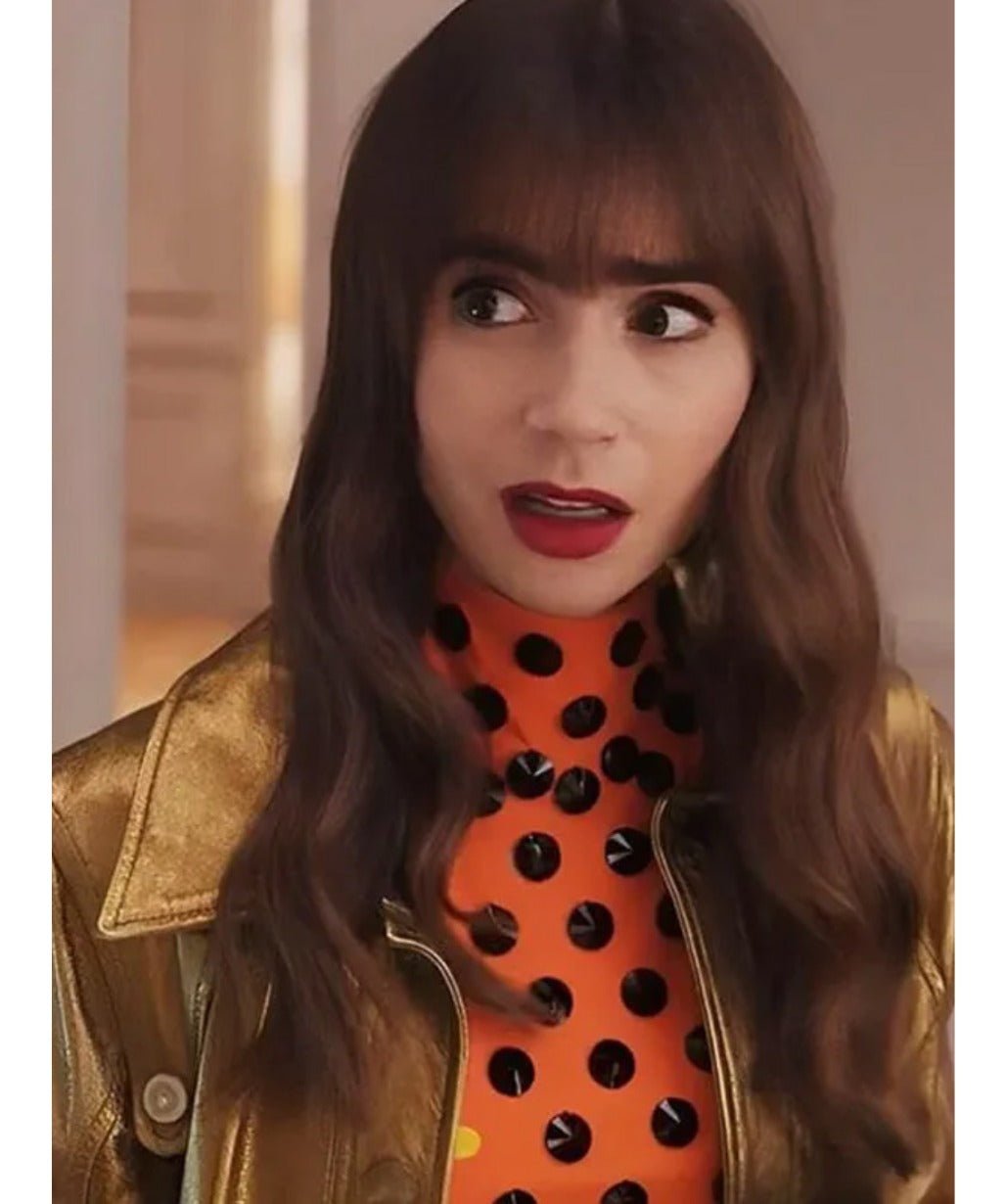 Lily Collins Emily in Paris S03 Emily Cooper Golden Leather Trench Coat
