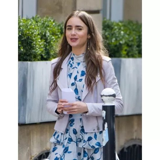 Lily Collins Emily in Paris Emily Cooper White Leather Jacket