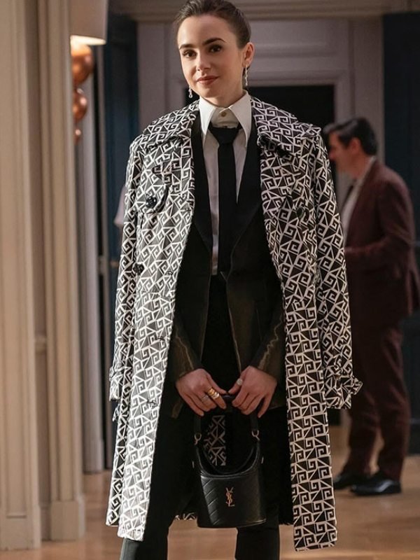 Lily Collins Emily In Paris Season 04 Emily Cooper Black And White Geometric Cotton Coat